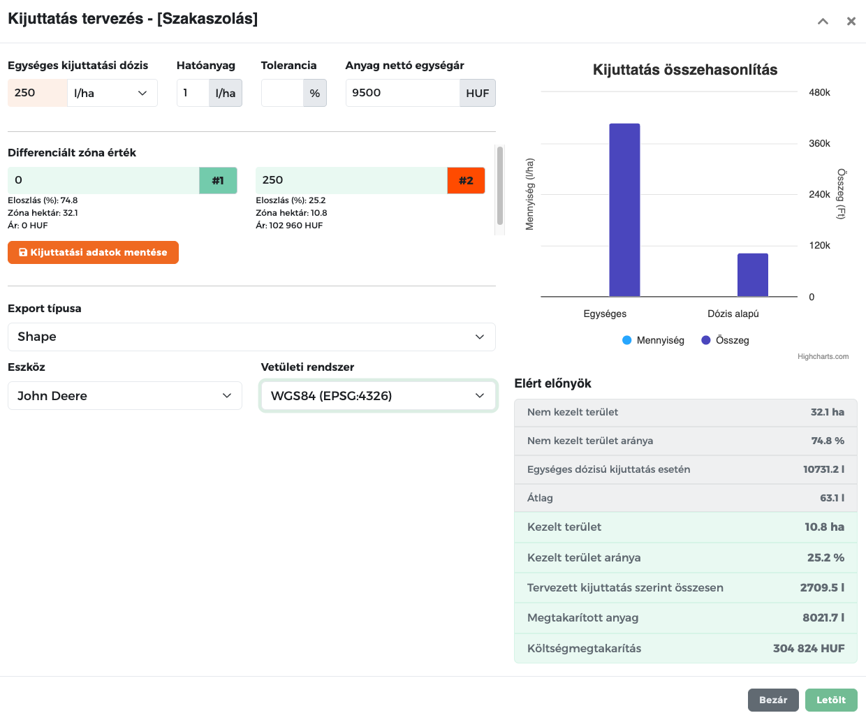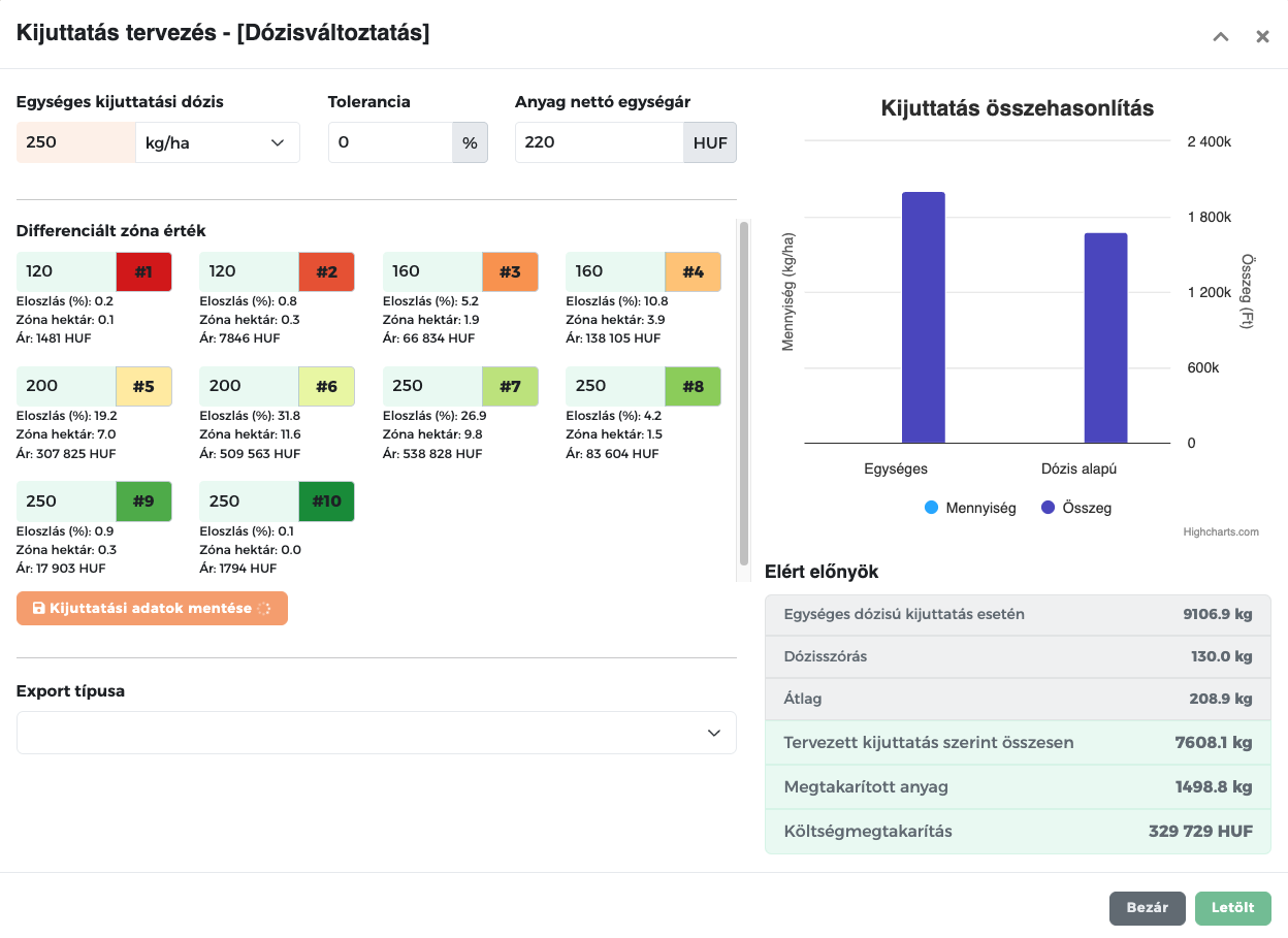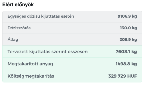 Kattints a „Kijuttatási adatok mentése” gombra – a rendszer kiszámítja az eredményeket, és automatikusan összehasonlítja az egységes kijuttatással.