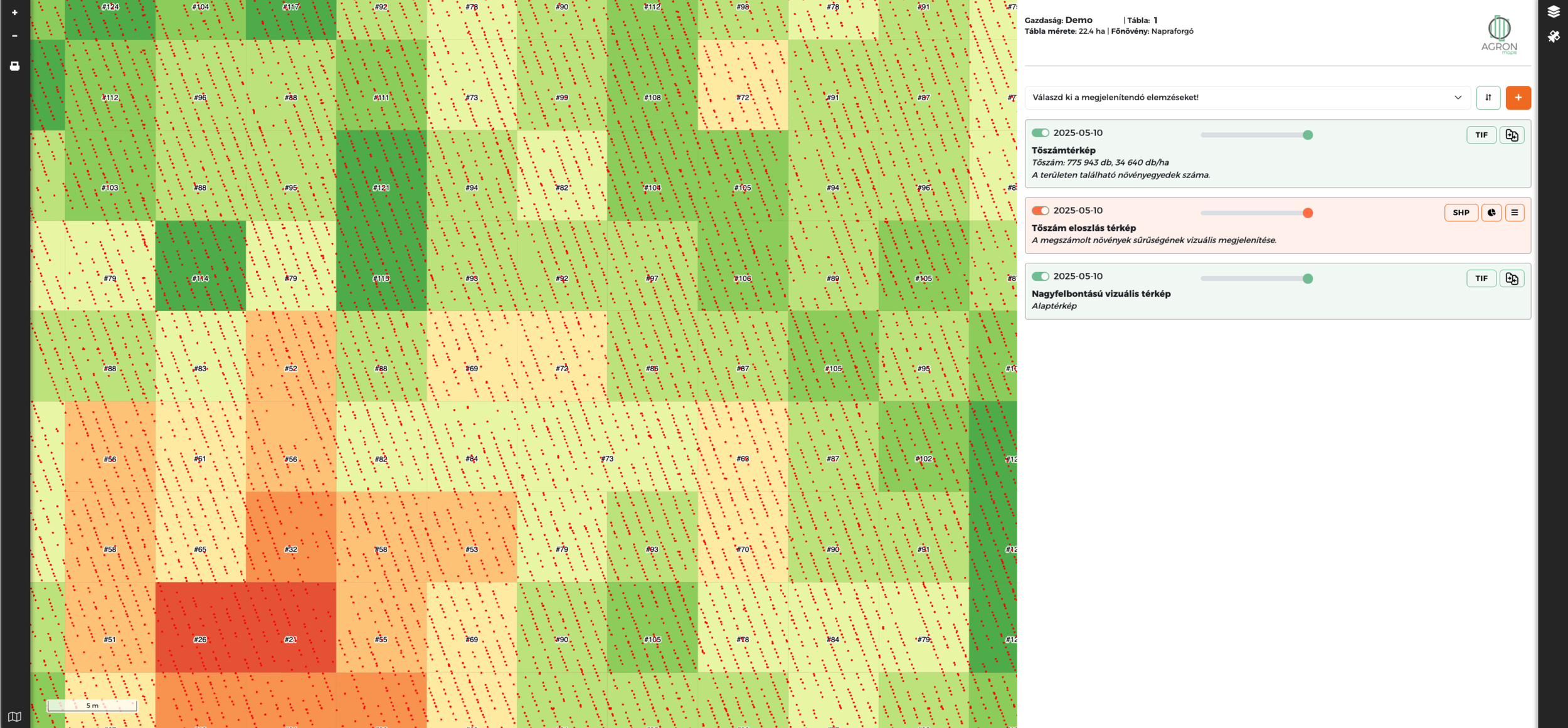 Ha tudod, hány magot vetettél hektáronként, a tőszám alapján egyszerűen kiszámolható a kelési arány – ez pedig a szezon első kulcsadata. Pontosan láthatóvá válik, hol sikerült jól a kelés, és hol vannak problémás zónák. A növényszintű térképek révén azonosítható a ritkulás oka: vetéstechnikai hiba, gyenge magágy, tömörödött talaj, kártevők vagy vadkár.