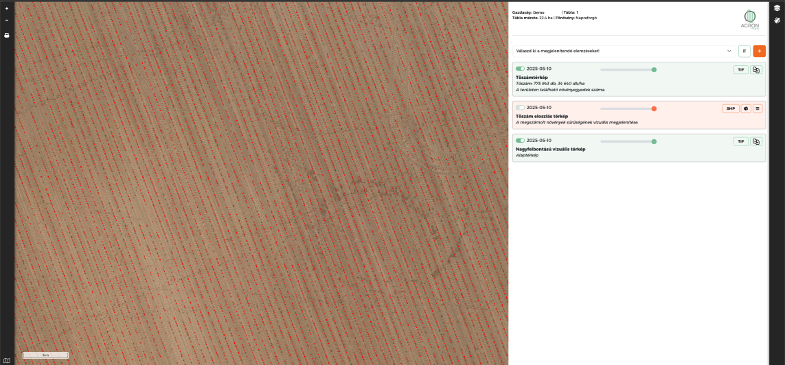 Az AGRONmaps Pro platformban minden adat RTK pontossággal kerül feldolgozásra, így a vetési, kelési és záródási térképek pontos fedésben jelennek meg. A szoftver nemcsak megjeleníti a térképeket, hanem a teljes elemzési folyamatot is automatizálja: